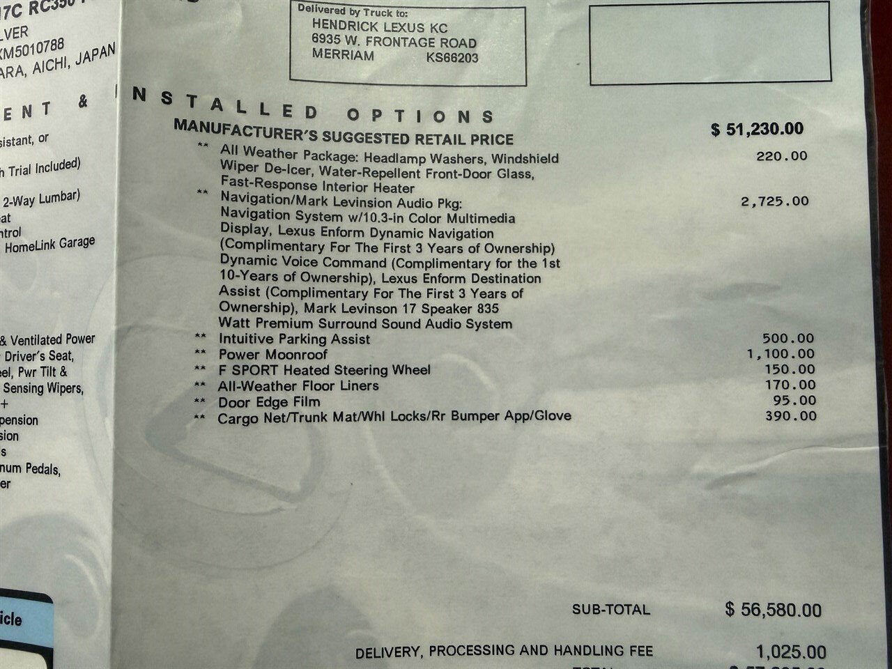 - Optional and installed items on this vehicle: Mark Levinson PurePlay, All-Weather Floor Liners, F SPORT Heated Leather Steering Wheel, Cargo Net, Door Edge Guards, Smart Access Key Glove, Power Moonroof, and Intuitive Parking Assist.