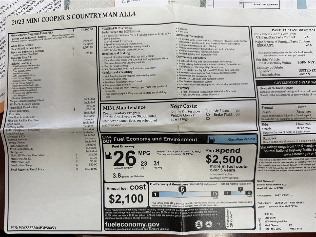 With only one owner and low mileage of below 21,000 miles, averaging less than 7,000 miles per year, this vehicle has been meticulously maintained and cared for. It boasts an excellent fuel efficiency rating of 23 MPG in the city and 31 MPG on the highway, making it ideal for both daily commutes and long road trips. The clean CARFAX report and dealer inspection ensure that this MINI Cooper S Countryman All4 is in pristine condition, free from scratches, dents, or rust.